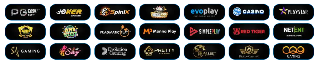 มีมากกว่า 30 ค่ายชั้นนำทั่วโลก เช่น PG Soft, Pragmatic Play, Joker, Jili, Red Tiger และค่ายยุโรปหลายค่าย รวมถึงเกมใหม่อัปเดตทุกสัปดาห์
